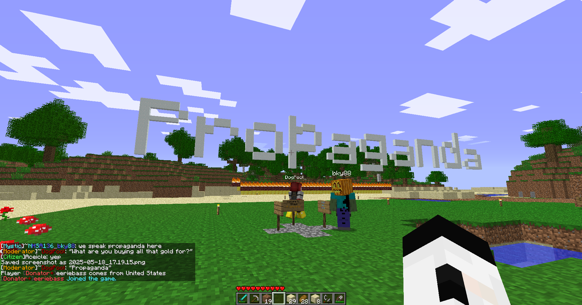 Propaganda began as a joke response when DogPool_ asked what I was doing with the gold I was purchasing from his shop. The gold was going to be used to make a memorial statue of PunisherGames, a banned player on RMC (RetroMC).